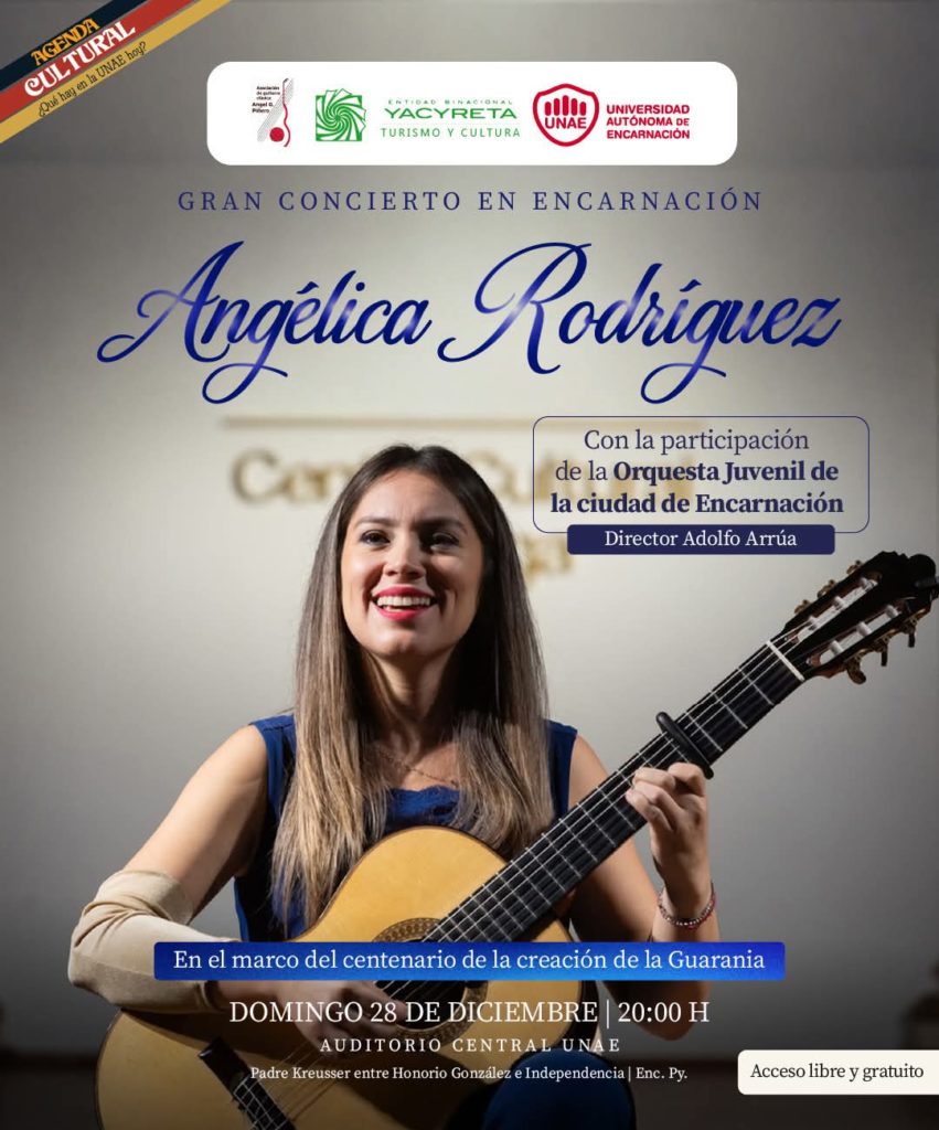 On Sunday, December 28, the Universidad Autónoma de Encarnación – Paraguay (UNAE) hosted at its main auditorium the concert of Paraguayan classical guitarist and lyric singer Angélica Rodríguez, within the framework of the commemoration of the centenary of the Guarania.