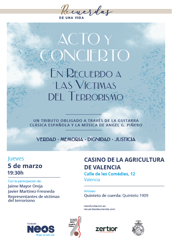 Le jeudi 5 mars 2026, le Casino de Agricultura de Valence accueillera un nouveau concert du cycle ReCuerdas de una Vida, organisé par la Fondation NEOS et l’Association de Guitare Classique Ángel G. Piñero. Cet événement constitue le premier concert conjoint de NEOS et ReCuerdas en 2026, poursuivant ainsi la collaboration entre les deux entités.